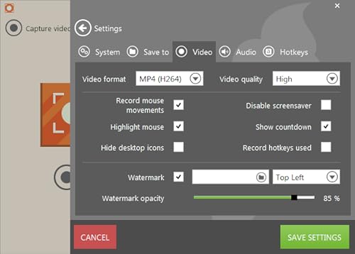 • Customize recording and screenshot area to work with manually or select one of the offered presets (including Full Screen mode);