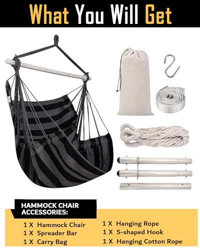 ADVOKAIR Hammock Chair Swing (500 lbs Max) - Hanging Hammock Chair Rope Swing Indoor for Bedroom, Outdoor, Patio, Bedroom, Porch, Deck - Sturdy Steel Bar with Anti-Slip Safety Rings, B Black and Grey