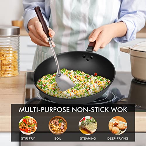 • Carbon Steel Wok Pan - 13” Wok Pan with Lid, Nonstick Woks and Stir-fry Pans, No Chemical Coated Chinese Wok with 4 Cookware Accessories Flat Bottom Wok for Induction, Electric, Gas, All Stoves