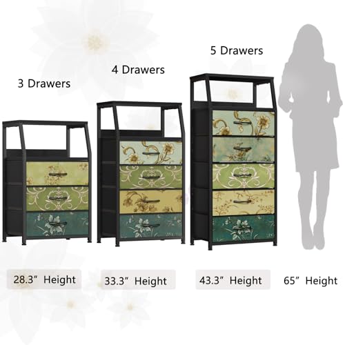 Furnulem Retro Dresser for Bedroom, Small Dresser for Closet, Vintage Nightstand with 4 Drawers, Fabric Storage Organizer Bedside Table Side Furniture, Metal Frame, Wood Top, Vintage Floral