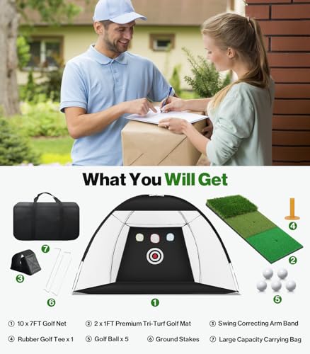 • Golf Net: 10 x 7ft Golf Hitting Practice Net for Backyard Driving, Indoor & Outdoor Chipping Training Net with Mat, Targets & Balls, Ideal Gifts for Him Men Dad Husband Grandpa Boys Golfers