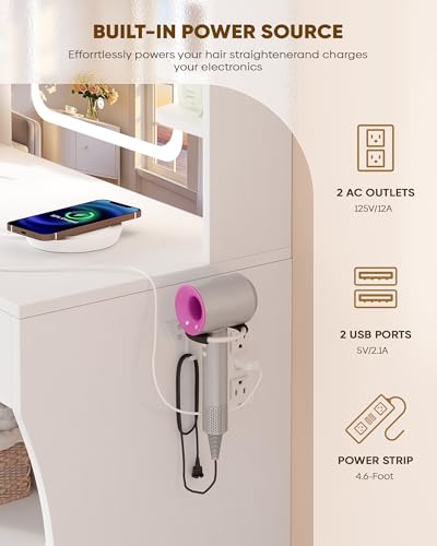 • LIVELYGLOW Small Makeup Vanity Desk, 29.5" W x 15.8" D x 51.2" H, White (Smart LED Mirror, Hairdryer Rack, Power-Outlet, 5 Shelves, 2 Drawers)