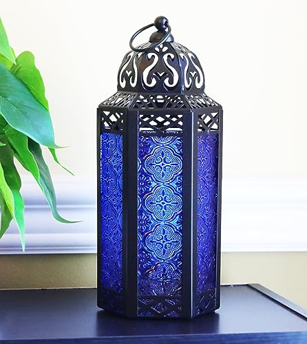 VELA LANTERNS Moroccan Candle Lantern Decorative Candle Holder for Table or Hanging, Ramadan Decorations, Indoor Home Decor, Outdoor Patio or Porch, Weddings, Black Metal, Cobalt Blue Glass, Medium Item Sku: