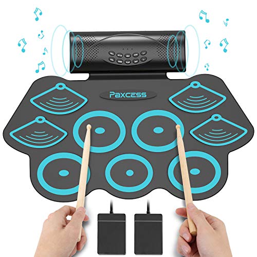 • PAXCESS 9 Pads Electronic Drum Set Rechargeable Drum Set with Headphone Jack,Portable MIDI Electronic Roll Up Drum Kit with Built in Speakers, Power Supply