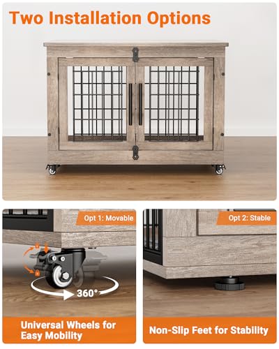 • YaFiti Dog Crate Furniture with Cushion, Wooden Dog Kennel with Double Doors, Heavy Duty Dog Cage End Table with Wheels, Dog House Indoor for Small Medium Dogs up to 45 lb, 32.5” L, Grey