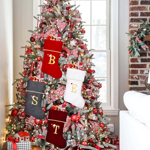 Subyan 20 Inches Initial Monogram Green Christmas Stocking, Personalized Large Embroidered Letter Velvet Christmas Stocking with Gold Trim Decoration for Family Christmas Holiday Party Decor(Letter H)
