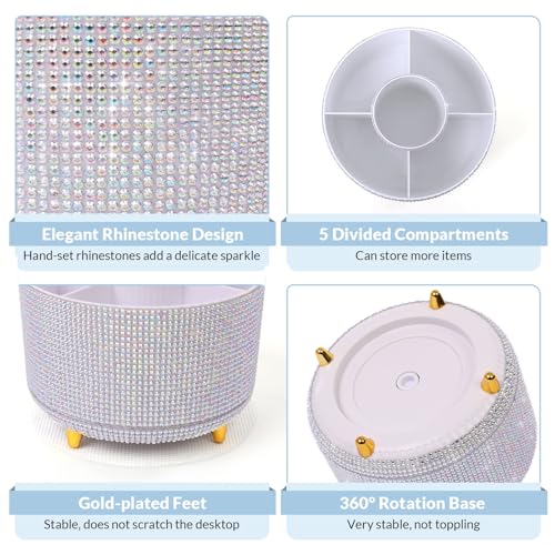 SKYDUE 360 Degree Rotating Desk Organizer, Shining Dual-Purpose Rhinestone Pencil Pen Holder, Rotating Desk Pen Organizer with 5 Slots, Rhinestone Pencil Cup for Office, School, Home, Crystal White