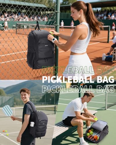 • sportsnew Pickleball Bag, Waterproof Pickleball Backpack for Women Men with Shoe Compartment & Fence Hook, Black Patent Pending